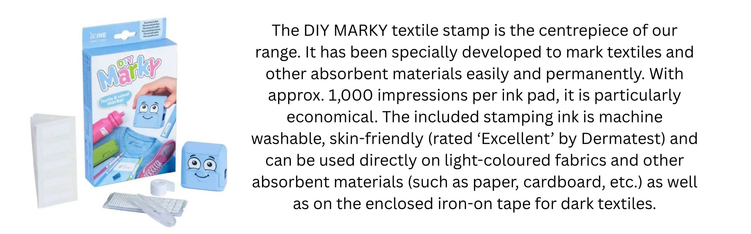 1 stamp (including a cover for easy transportation) with ink pad (black textile ink) for app. 1,000 imprints