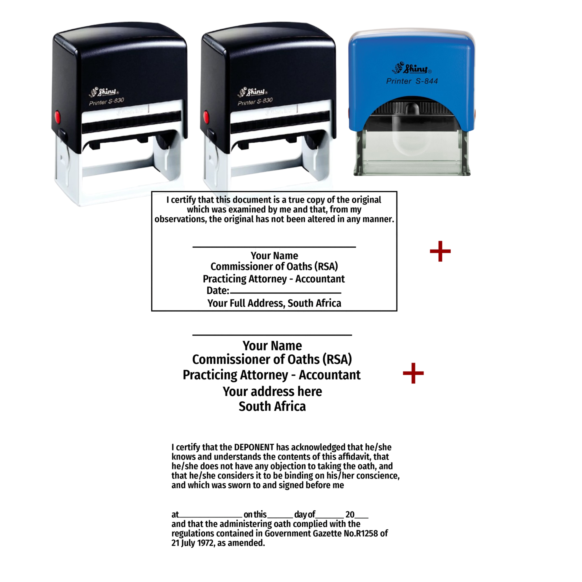 The Full Commissioner Set includes the three essential stamps used daily by Commissioners of Oaths across South Africa.